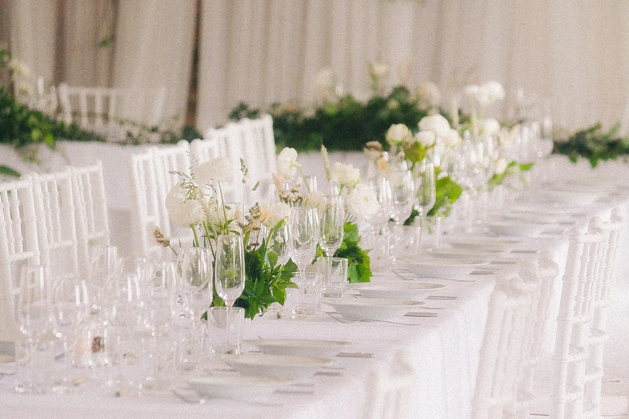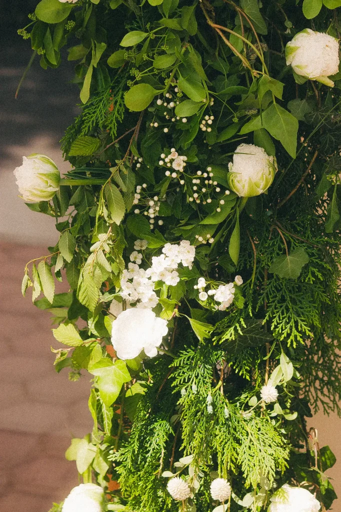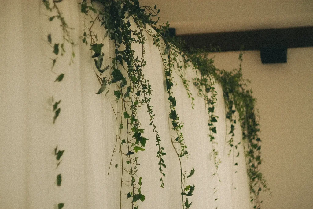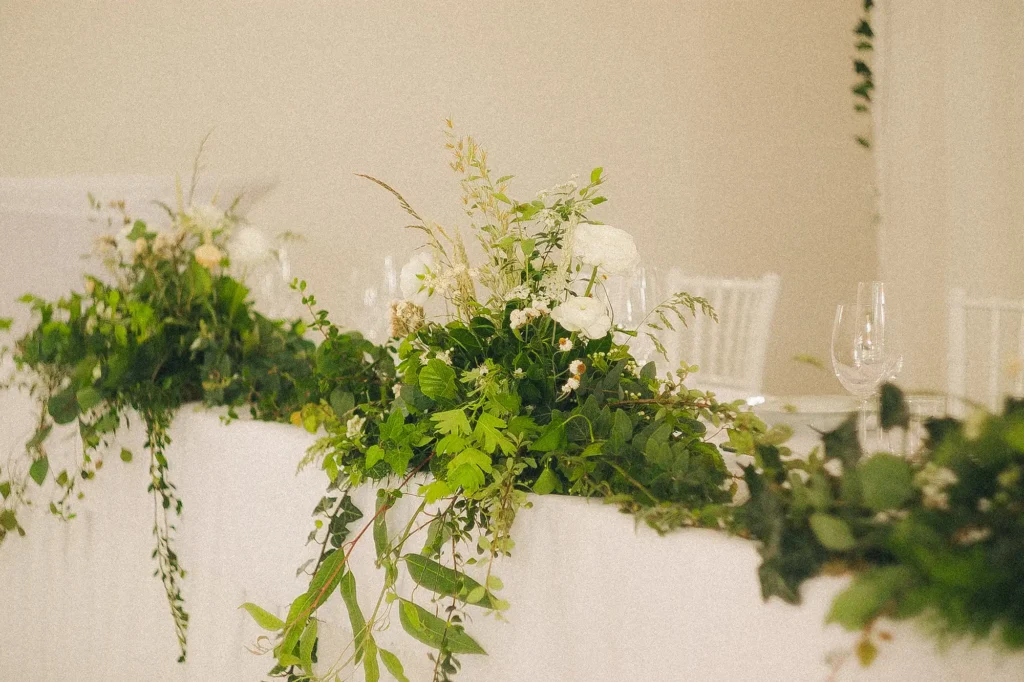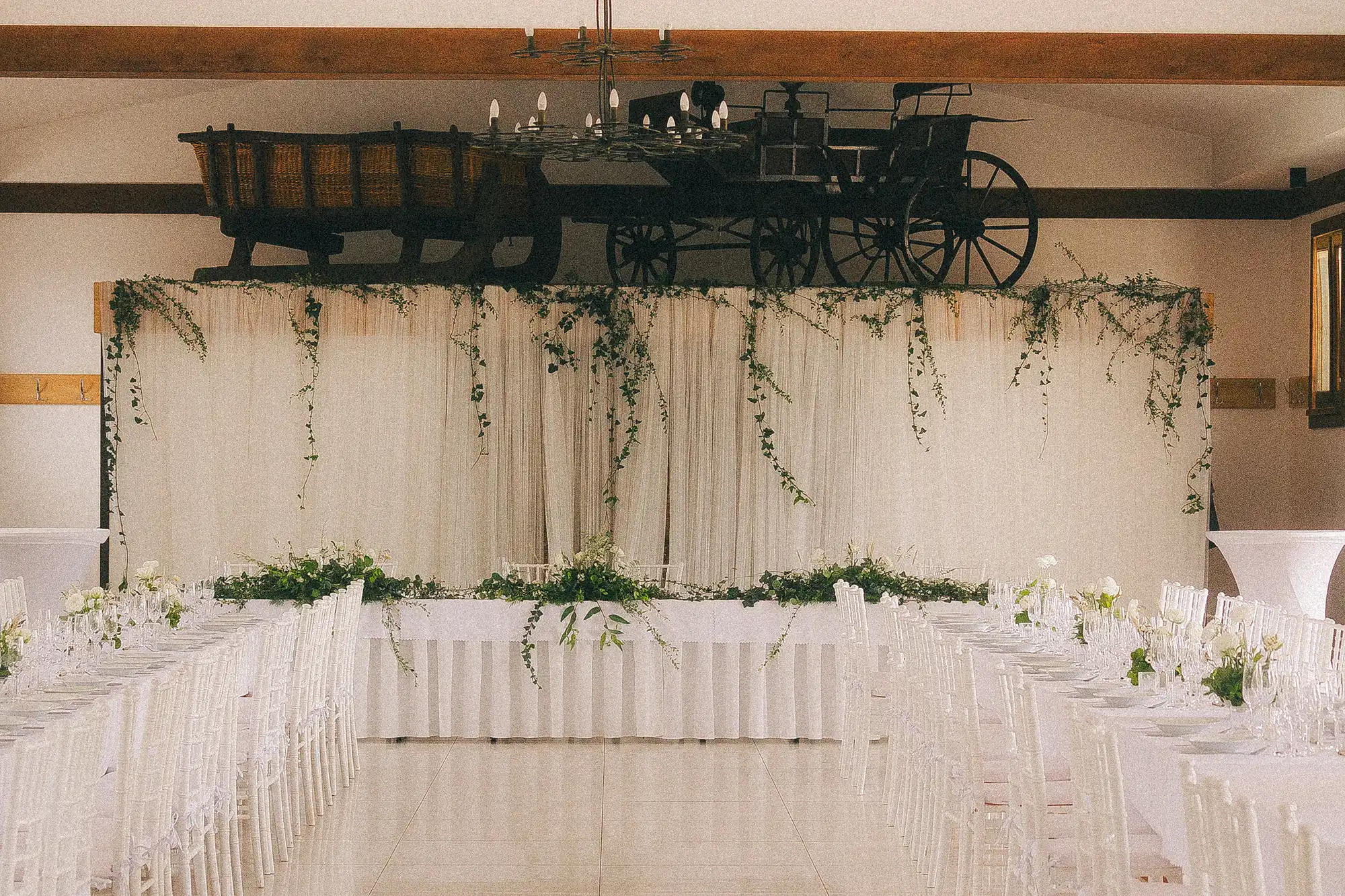 Dizajn stál na kontraste zelenej a bielej – farieb, ktoré pôsobili čisto a sviežo. Za mladomanželským stolom sme vytvorili záves z lístia, jemne podsvietený drobnými svetielkami, ktoré pôsobili ako žiariace hviezdy v pozadí. Celková výzdoba bola minimalistická, no mala silu – každý prvok bol zvolený tak, aby pôsobil harmonicky.