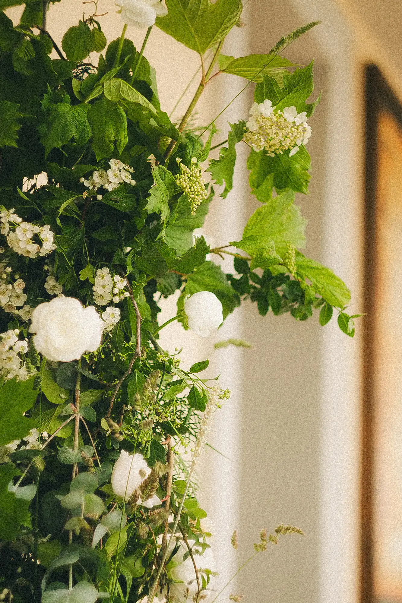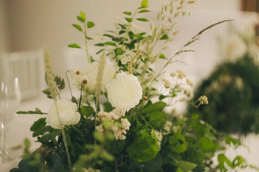 Hlavnú rolu zohrali tulipány, polné trávy a klasy pšenice, ktoré odkazovali na vzťah mladého páru k prírode a poľnohospodárstvu. V aranžmánoch sa prelínali s bielymi kvetmi a zeleňou, čím vytvorili pocit prirodzenej elegancie. Kvety pôsobili ľahko a vzdušne, čím podporili minimalistický charakter výzdoby.