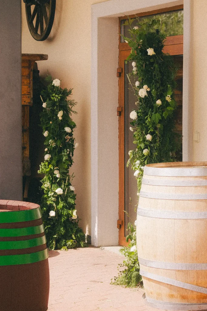 Svadobná hostina sa konala v Zemianskom dvore – priestore, ktorý prirodzene spája históriu s autentickou atmosférou vidieka. Vstup do sály lemovali dva kvetinové stĺpy, ktoré hostí vítali do priestoru ladenej noblesnej jednoduchosti.